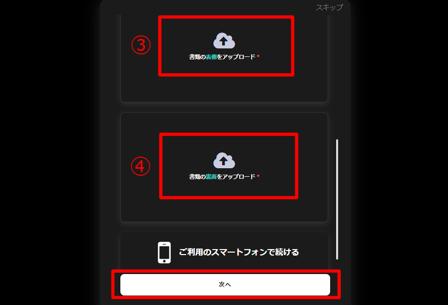 | ②書類の裏面をアップロード | 本人確認書類の裏面を撮影してアップロードする |