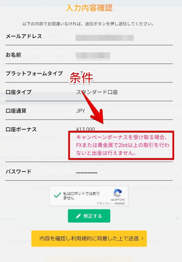 この場合は、ボーナスを使った取引で得た利益は、FXまたは貴金属で2Lot以上の取引の条件を達成しないと出金はできません。