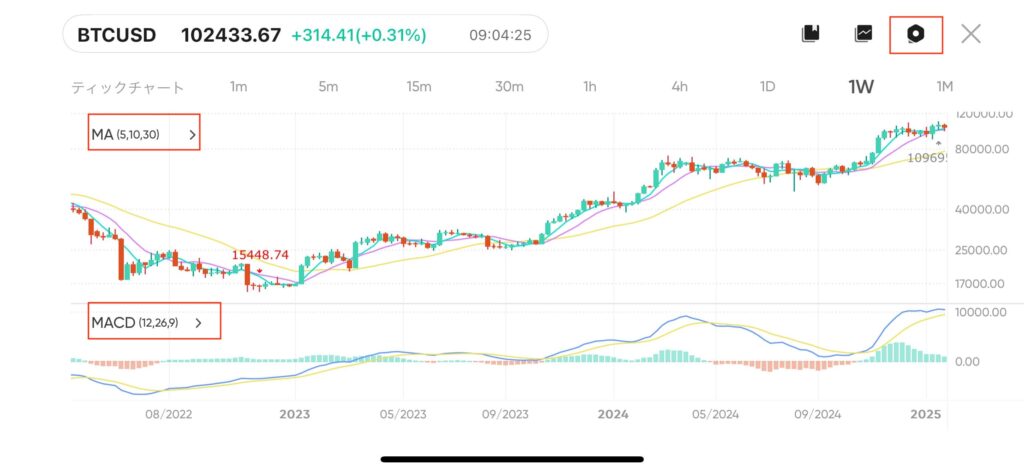 インジケーターなどを確認するにはチャート画面左下の四角いアイコンをタップして切り替えます。