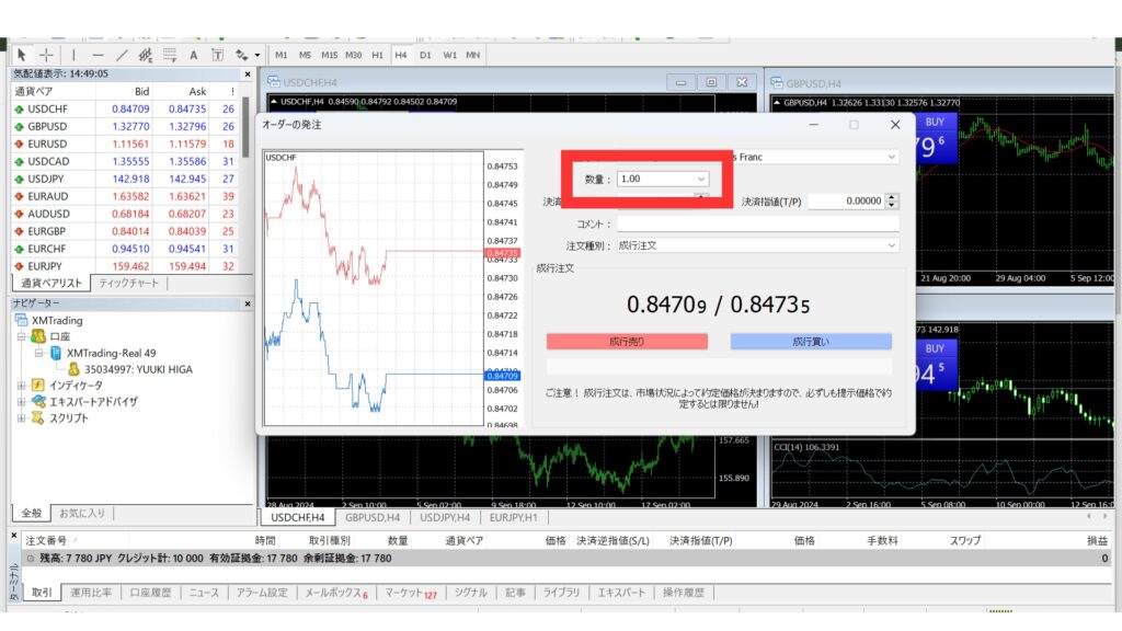 「数量」に取引したいロット数を入力します。