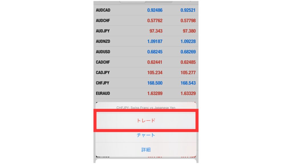 MT4/MT5アプリを起動し、取引したい銘柄をタップし、表示されたメニューから「トレード」を選択します。