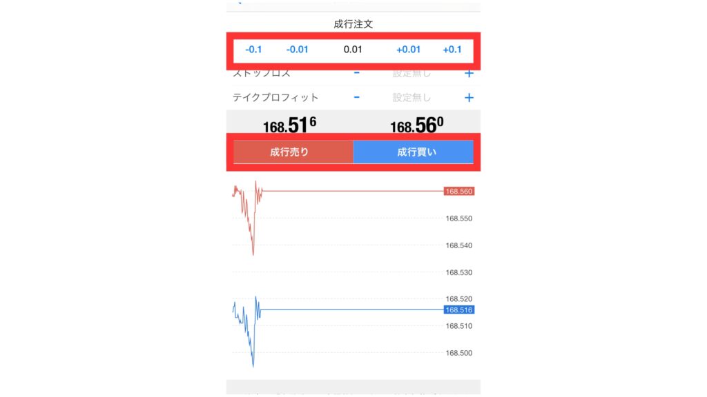 注文画面が表示されたら、ロット数を入力する欄に希望するロットを入力し、「成行買い」または「成行売り」ボタンをタップして注文を実行します。