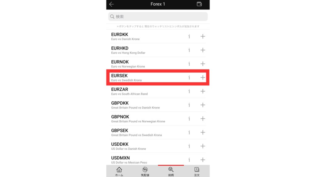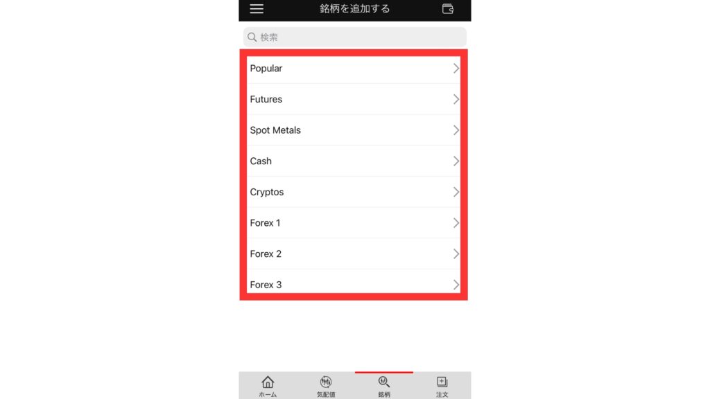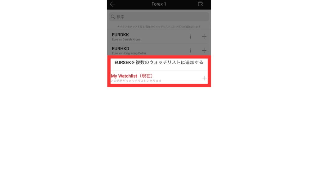 タップ後、My Watchlistに追加した銘柄が表示されるので、タップすると選択した銘柄のチャート画面に飛ぶことができます。