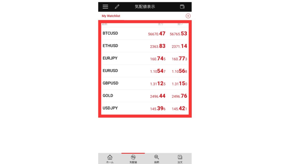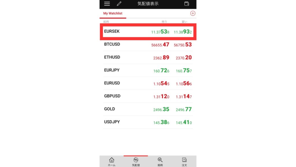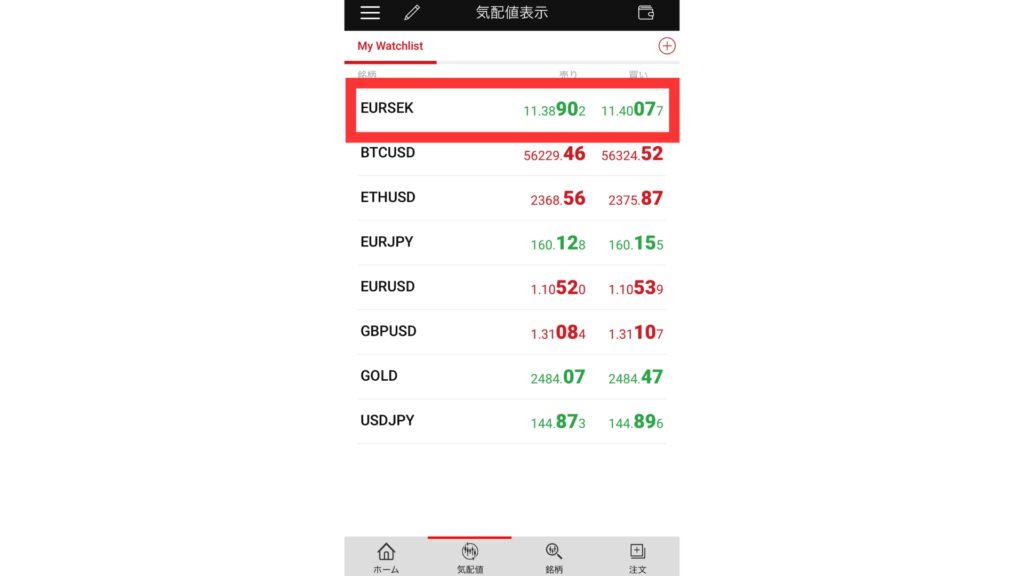 まずは気配値のリストから銘柄をタップします。