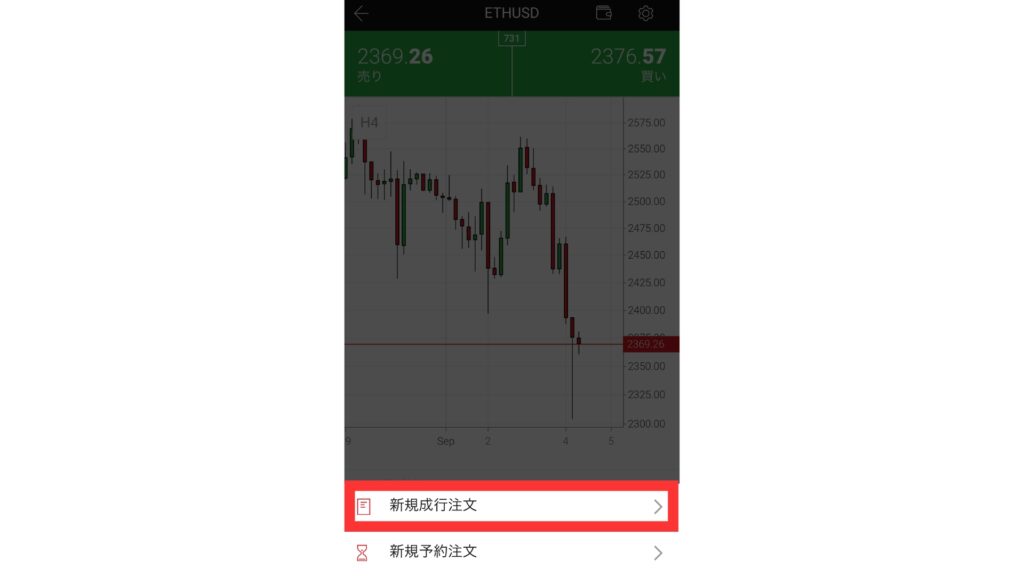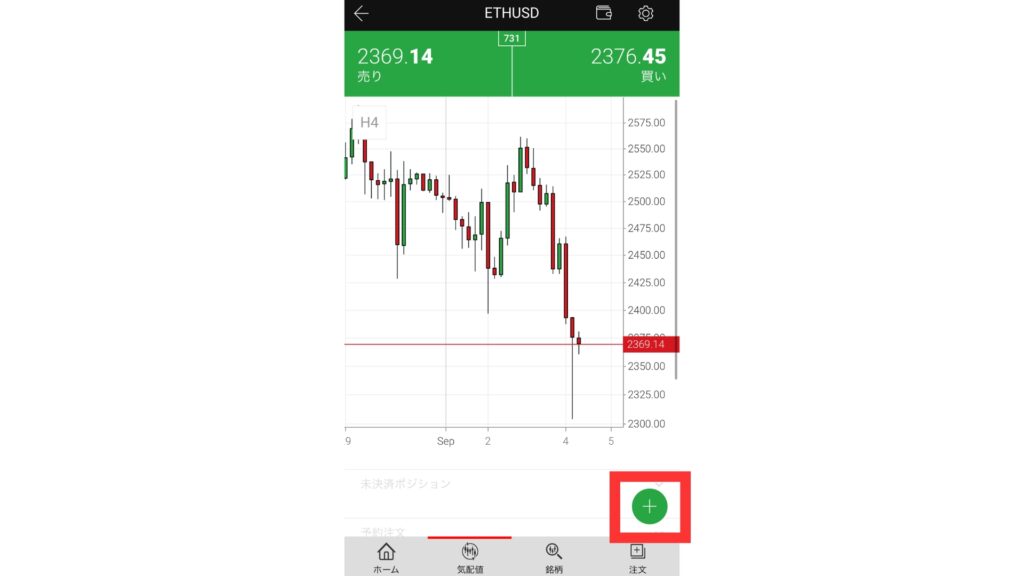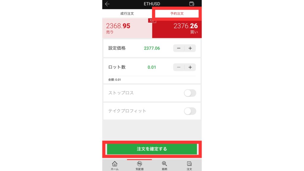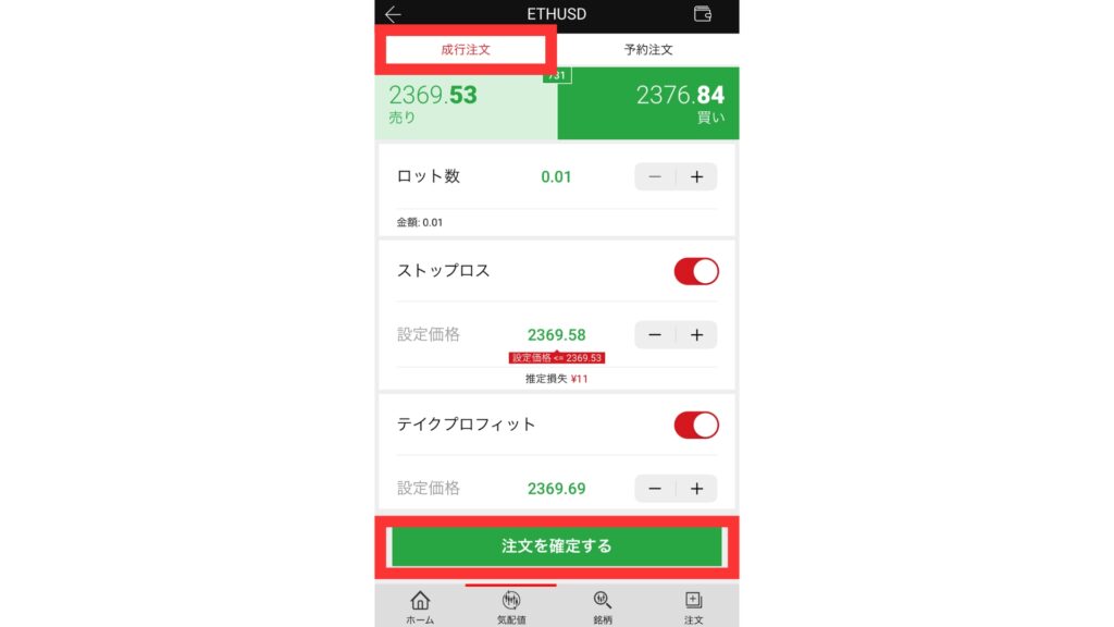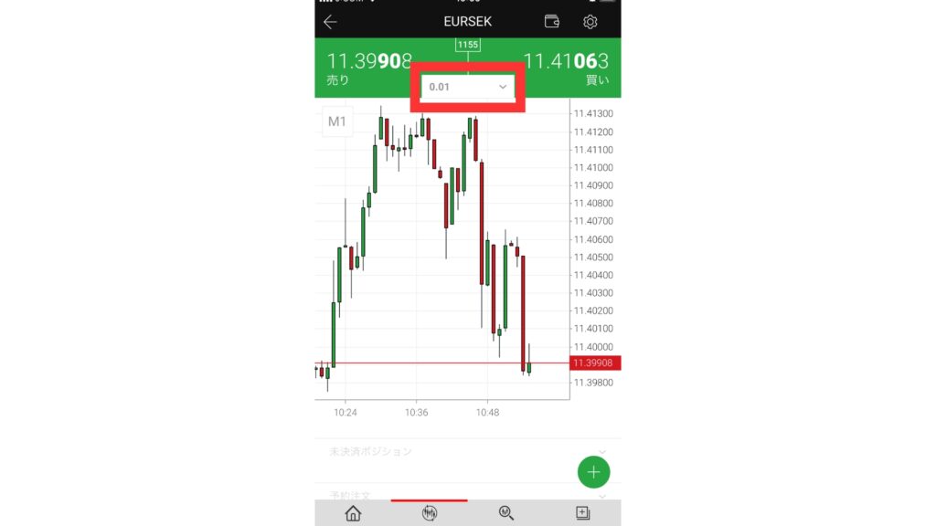 取引を開始する際はロット数を設定して、「売り」か「買い」をタップしてください。