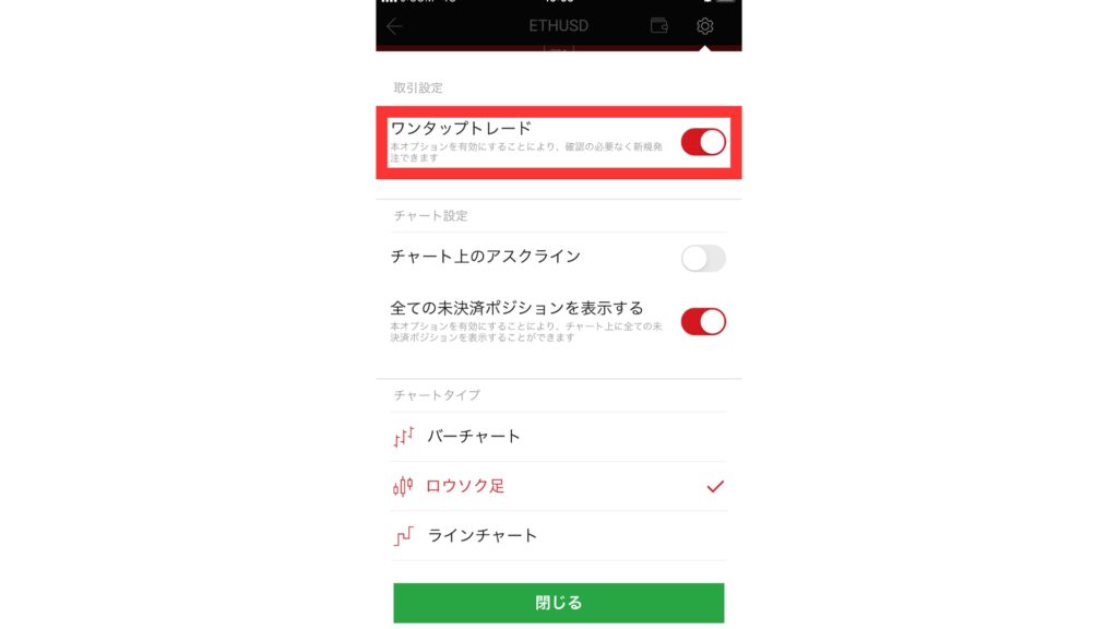 歯車を選択すると取引設定に「ワンタップトレード」があるので、右側のボタンを「赤」にします。