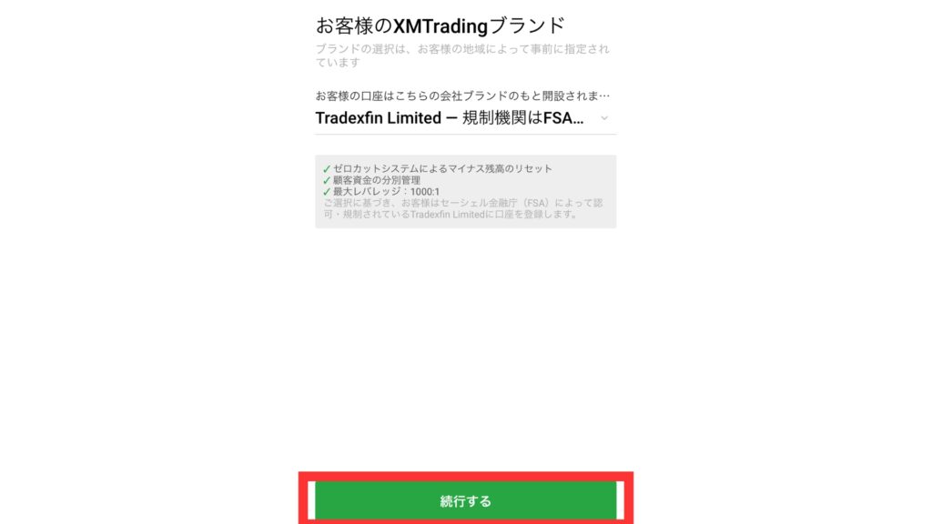 次はXMTradingブランドの選択ですが、どれを選んでも取引に影響はないので、こだわりがなければ、デフォルトの「FSA(Tradexfin Limited)」を選択しましょう。