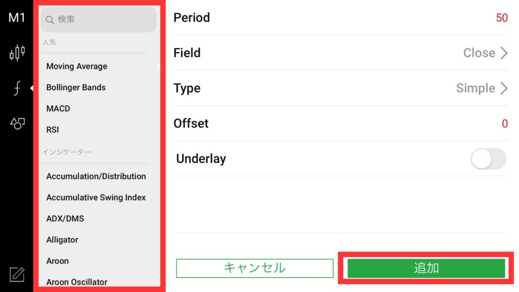 タップ後、「移動平均線(Moving Average)」や「相対力指数(RSI)」などのインジケーターが表示される。追加したいインジケーターの設定をした後、「追加」をタップして終了です。