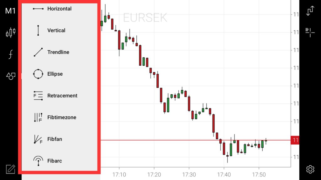 タップ後、「水平線(Horizontal)」や「トレンドライン」などが表示されるので、追加したいオブジェクトをタップすると反映されます。