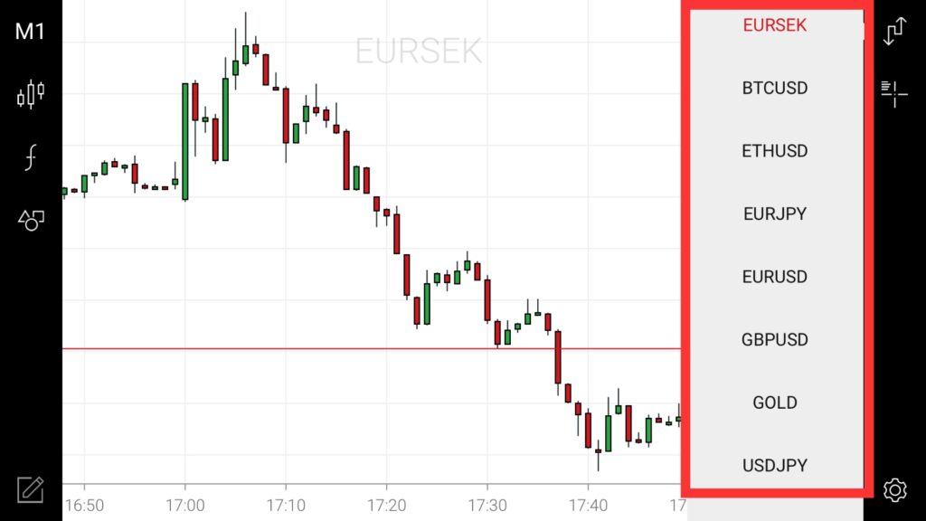 XM アプリでは取引銘柄の切り替えがチャート画面からも行えます。