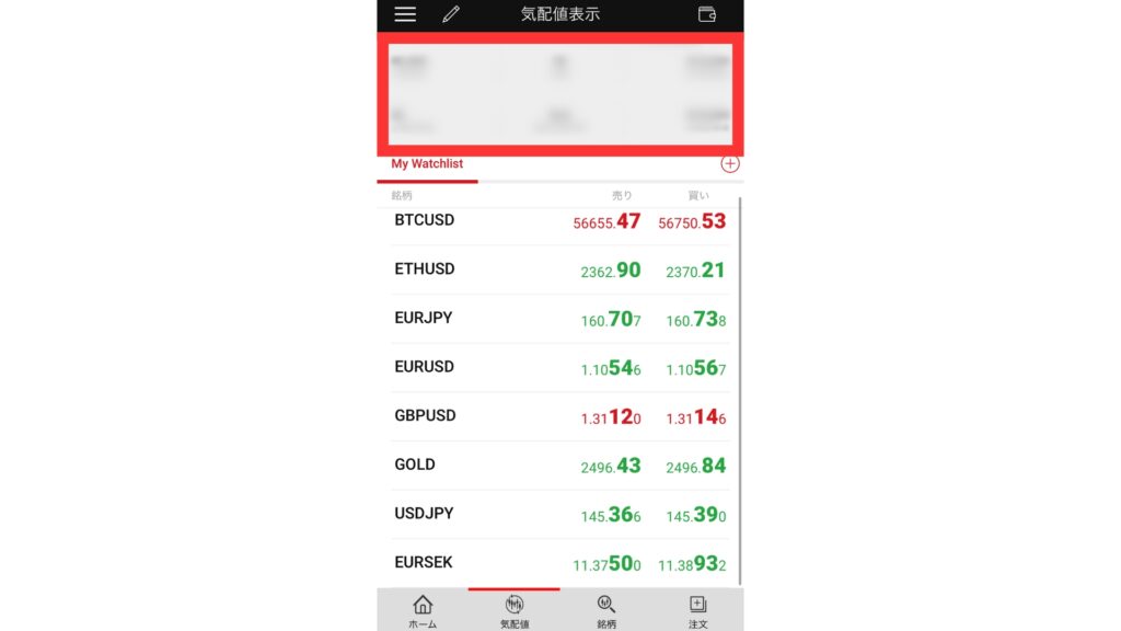 タップすると画面の上部に「口座残高」、「損益」「有効証拠金」などの口座の詳細が表示されます。