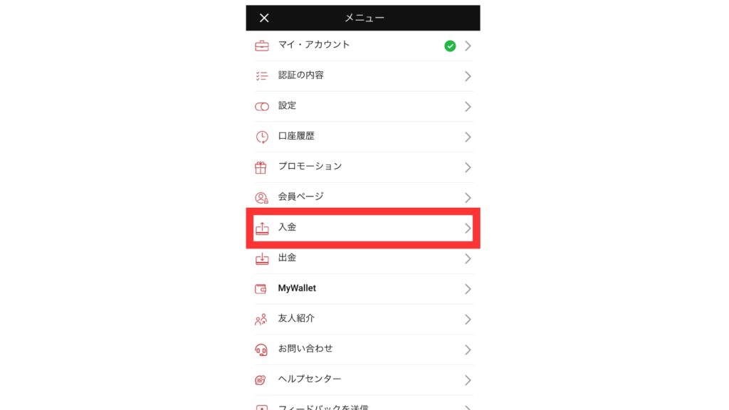 メニュー画面に飛んだら、入金をタップします。