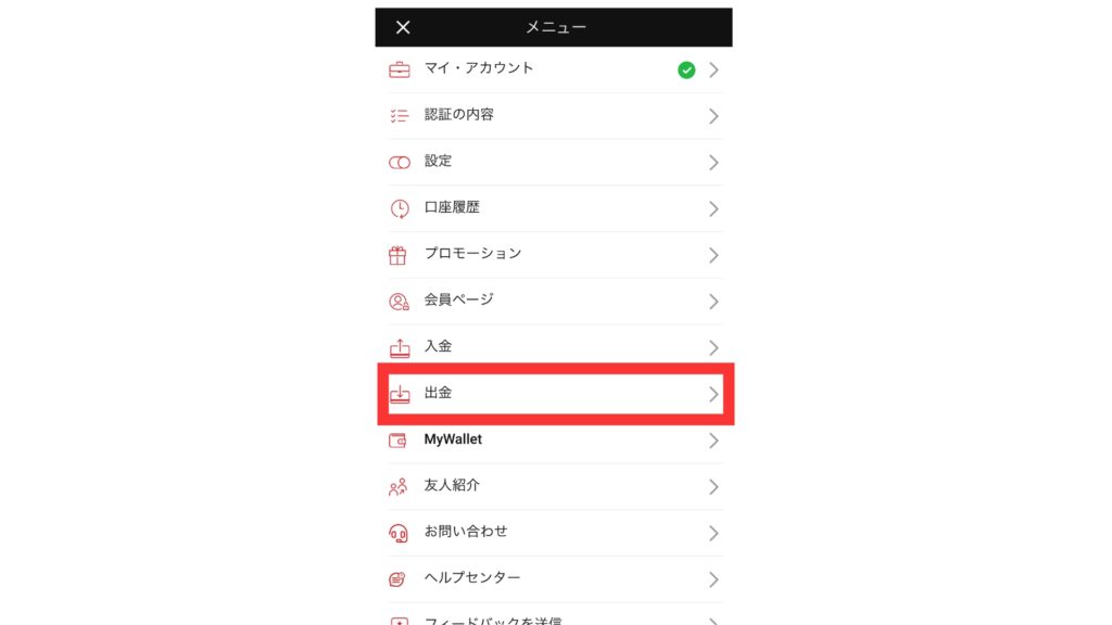 メニュー画面に飛んだら、出金をタップします。
