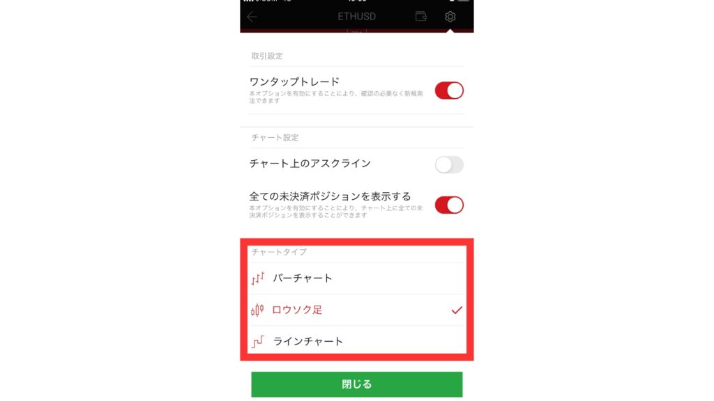 タップ後、チャートタイプに「バーチャート」、「ロウソク足」、「ラインチャート」とあるので、好みのタイプを選択します。