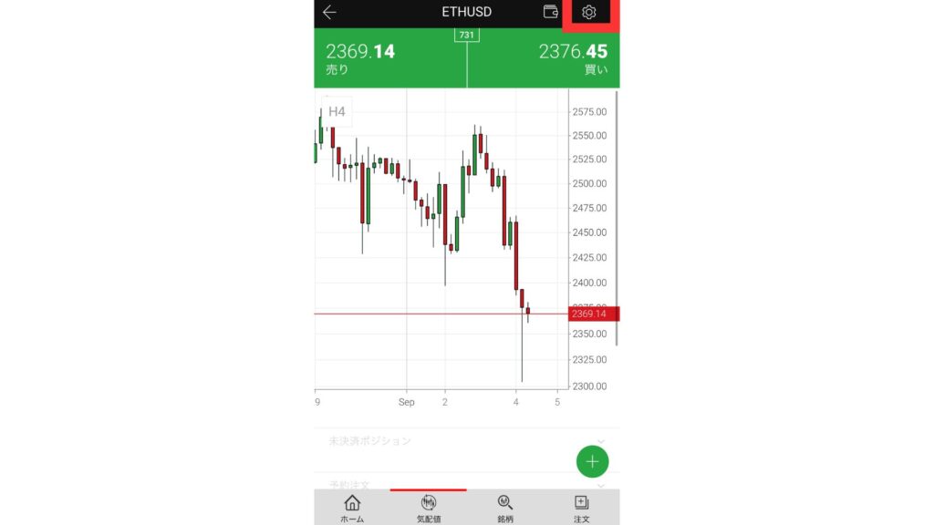 チャート画面に飛んだら画面右上にある「歯車」のボタンをタップします。