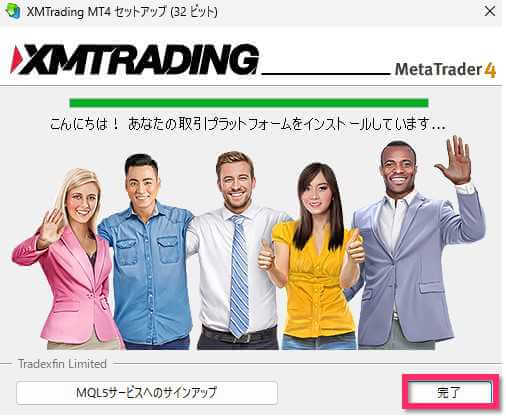 インストールが終わると「完了」ボタンが表示されるので、クリックします。