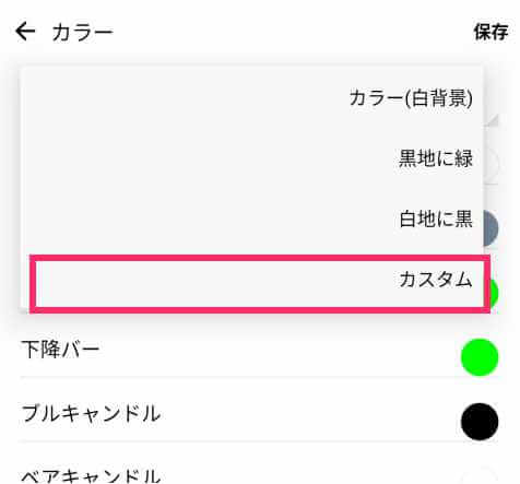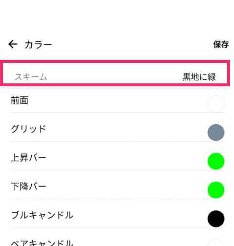 スマホ版のMT5では、直前に設定したチャートの配色の保存はできますが、過去の色設定を呼び出すことはできません。