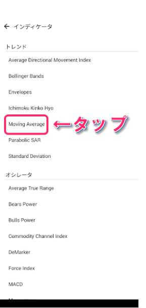 一覧の中から自分が使うインジケーターを選択してください。(今回は例としてMoving Average(移動平均線)をタップします。)
