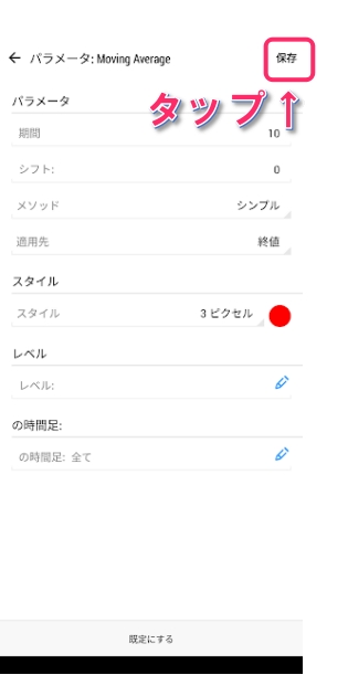 インジケーターを選択すると下のような各インジケーターのパラメーターや表示スタイルを選択する画面が表示されるので、適宜調整して保存をタップします。