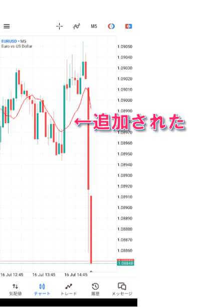 チャートに戻ると、移動平均線がローソク足チャートに追加されていることが確認できました。