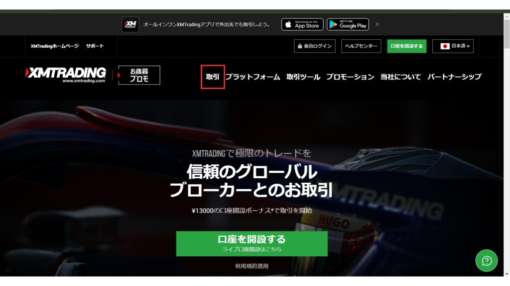 まずはXMの公式サイトを開いて「取引」をクリックしてください。