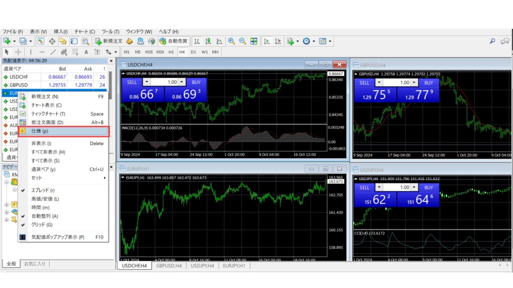 まずは、MT4またはMT5を起動し、ページ左側にある銘柄を右クリックします。