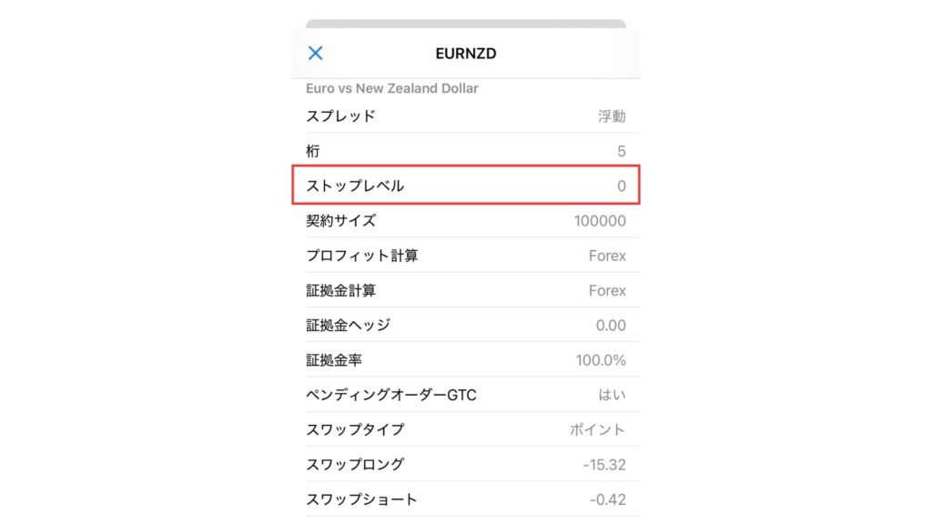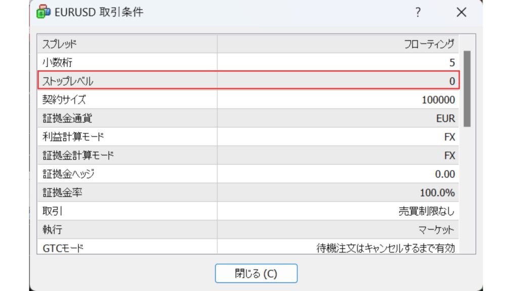 仕様選択後、商品(今回は通貨ペア)の取引条件がでてきます。表の上から三番目にある「ストップレベル」で確認することができます。