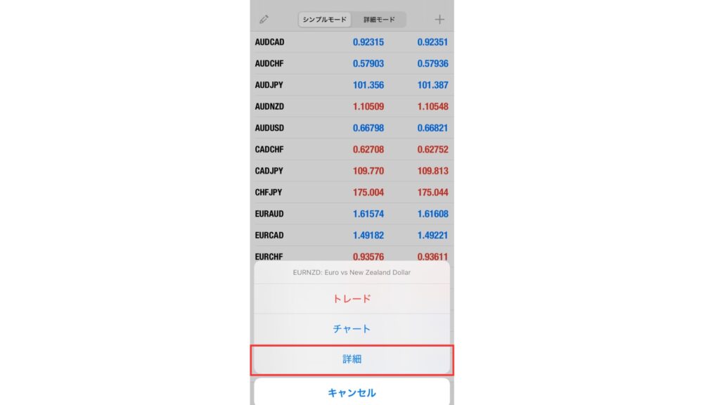 通貨ペアをタップすると上から三番目に「詳細」という項目が表示されるので、タップします。