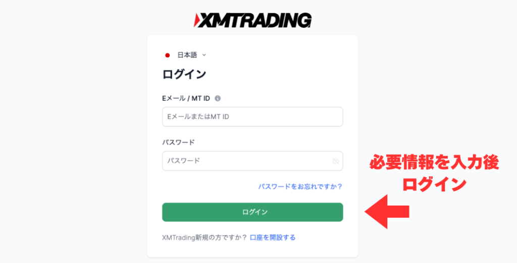 XMに登録済みのメールアドレスかID、パスワードを入力しましょう。