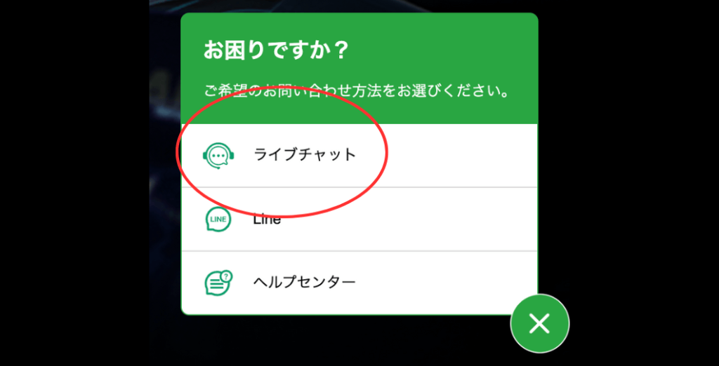 チャットボタンをタップすると以下の画面が表示されるので、ライブチャットを選択しましょう。